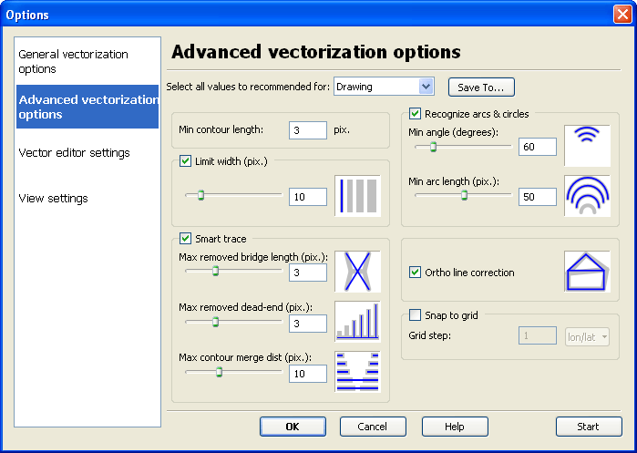Advanced vectorization options can be customized through the Vector|Options menu.